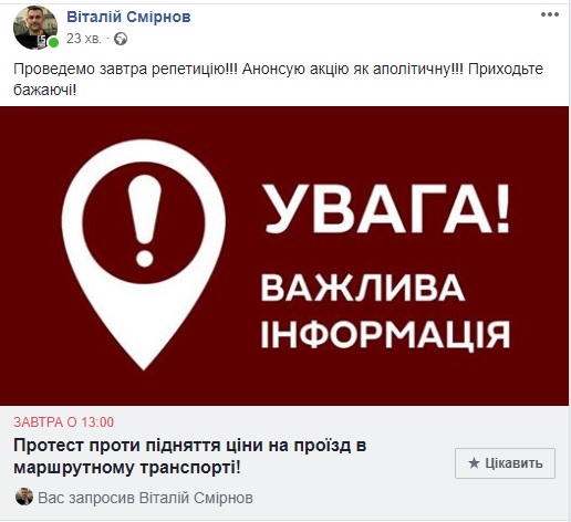 “Завтра на 13:00 на Площі Ринок біля входу в міську раду!!! Нас Двоє буде, точно!!! Чекаємо усіх, покажемо своєю присутністю, що Львівяни проти, необгрунтованого підняття тарифу на проїзд у міському транспорті, необлікованого руху готівки з перевезень і відсутності якості самого перевезення!!!
