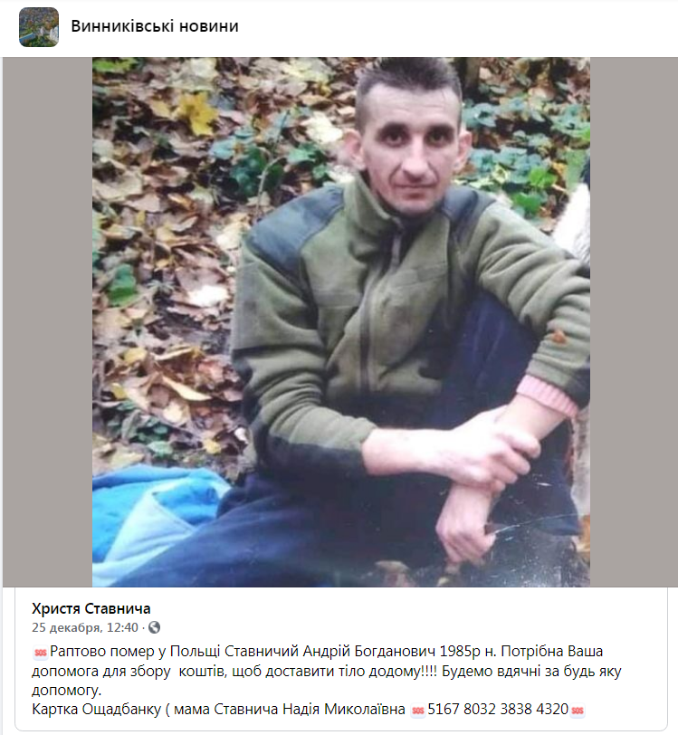 “Раптово помер у Польщі Ставничий Андрій Богданович 1985р н. Потрібна Ваша допомога для збору коштів, щоб доставити тіло додому! Будемо вдячні за будь-яку допомогу. Картка Ощадбанку (мама Ставнича Надія Миколаївна:5167 8032 3838 4320)”, – зазначає у дописі Христя Ставнича на сторінці спільноти “Винниківські новини”.