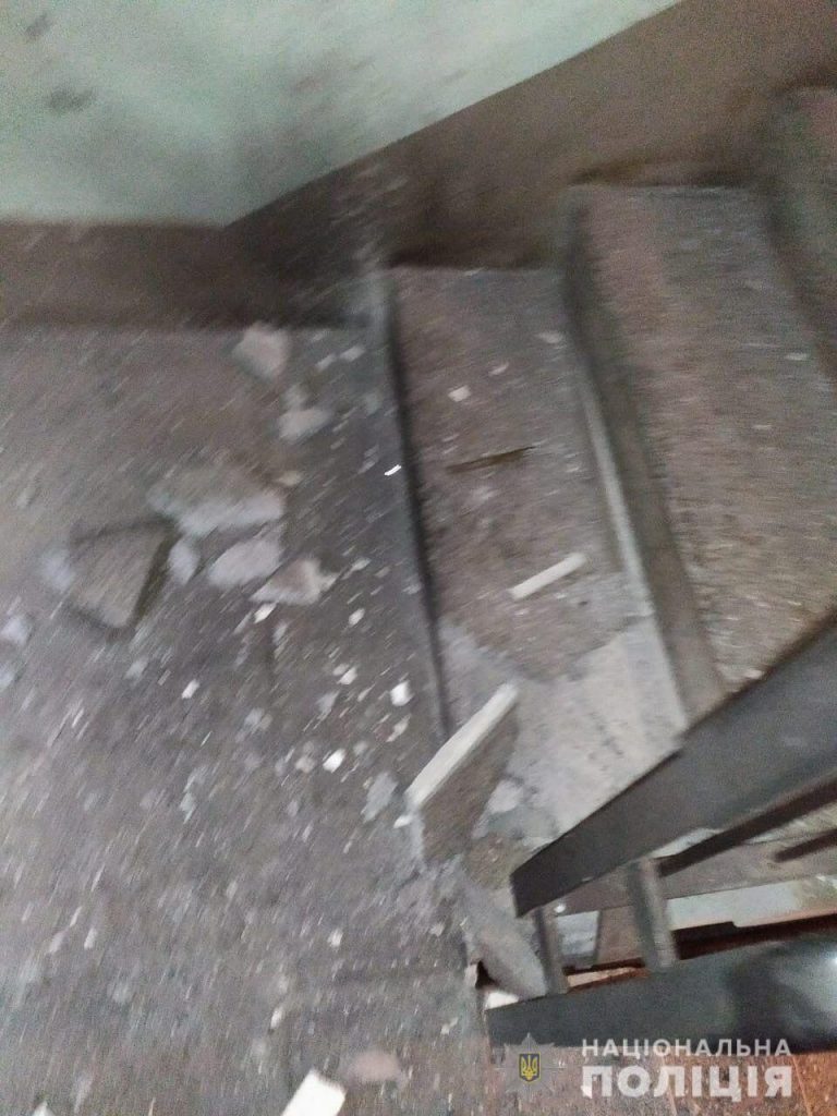 Як встановили правоохоронці, на сходовій клітці між другим та третім поверхами вибухнула граната, тип якої буде встановлено під час проведення експертизи. Потерпілих внаслідок вибуху немає.