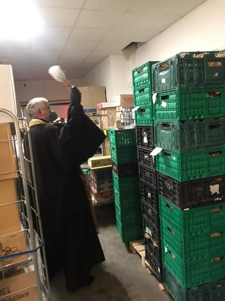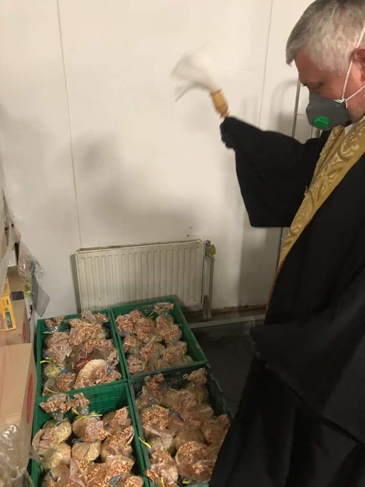 У Львові в супермаркеті “Сільпо”, що на проспекті Червоної Калини, 62, священик ПЦУ освячують паски перед тим, як їх придбають сихівчани. Відбувається дійство на складі супермаркету. Священнослужитель подбав про безпеку, одягнувши рукавички і респіратор.