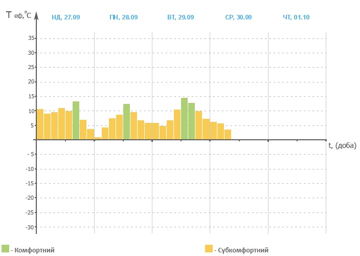 Згідно з графіком ефективної температури за показником Міссенарда, в Україні сьогодні і на початку наступного тижня будуть фіксуватися субкомфортні погодні умови.