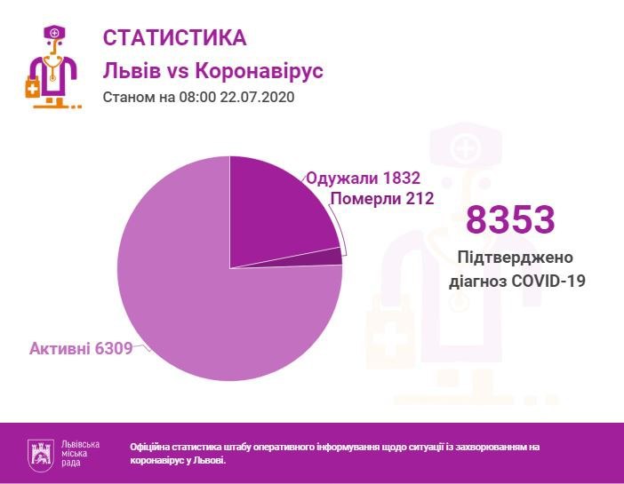 Станом на 08.00 год 22 липня у Львові та на Львівщині 8353 підтверджені випадки інфікування коронавірусом.