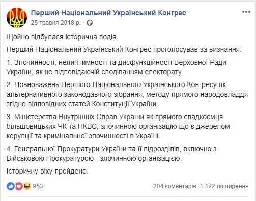 У травні 2018 року у столиці Чехії Празі відбувся захід під назвою “Перший національний український конгрес” (ПНУК). Його учасники проголосили себе єдиним легітимним законодавчим органом влади України, а Верховну Раду, Генеральну прокуратури та Міністерство внутрішніх справ оголосили злочинними організаціями.