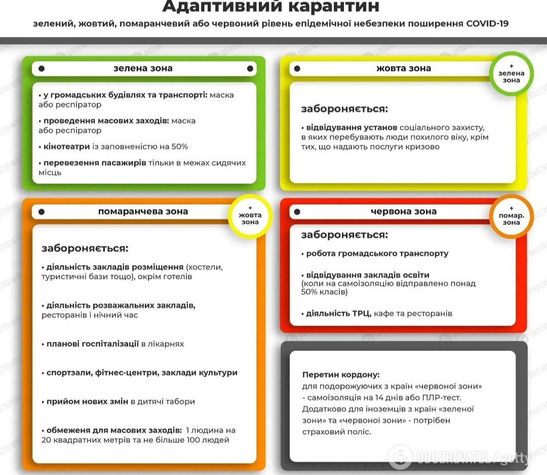 Загалом на території країни діятиме “жовта” зона. Якщо в тому чи іншому регіоні рівень епідеміологічної небезпеки підніметься до “помаранчевого” чи “червоного”, то місцева влада має вжити додаткових заходів для запобігання поширенню інфекції.