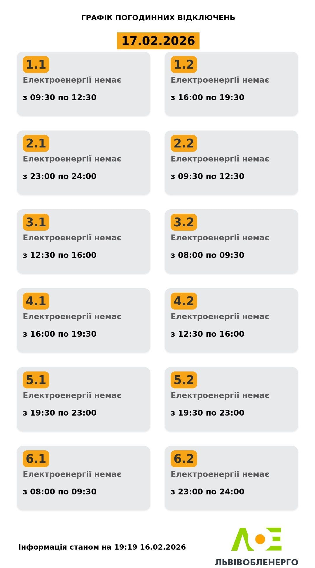 У вівторок, 17 лютого, на Львівщині діятимуть графіки погодинних відключень. Споживачів закликають економно використовувати електроенергію.