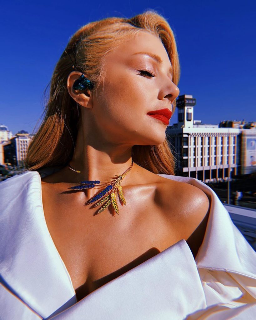 Як доповнення до образу Тіна Кароль додала на шию прикрасу у вигляді колосків, виконану в синьо-жовтій гамі в колір прапора України та каблучку з синіх і жовтих дорогоцінних каменів.